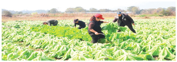12月8日,记者来到位于河沙村的芥菜种植基地里,10余名工人正手持镰刀穿梭其间,小心翼翼地收割,并将芥菜翻转,趁着阳光正好略微晾晒,等待下一步的装车。“这是今年第四批,也是最后一批芥菜,今天我们就要采收4万斤芥菜。”基地负责人邓志琼现场演示采收技巧,“镰刀要留有一定距离平切,避免损伤茎秆影响芥菜品质。”