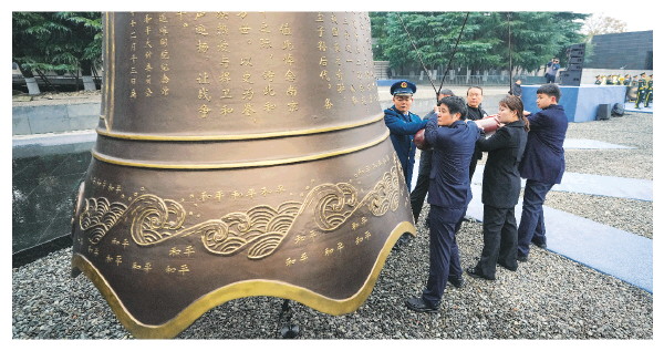 ◥12月13日,在南京大屠杀死难者国家公祭仪式现场,社会各界代表撞响和平大钟。 新华社记者李博 摄