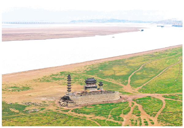 ▲鄱阳湖水位下降,湖区的千年石岛落星墩完全展露出来(12月13日摄,无人机照片)。 新华社发