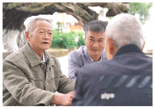 ▲余成中(左一)在劝说村民缩减宴席规模。