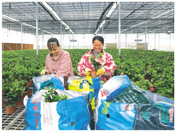 ▲荔浦马岭镇龙杜胆花卉苗木基地大棚内,花农正在分拣栽培花卉苗木。通讯员周俊远 摄