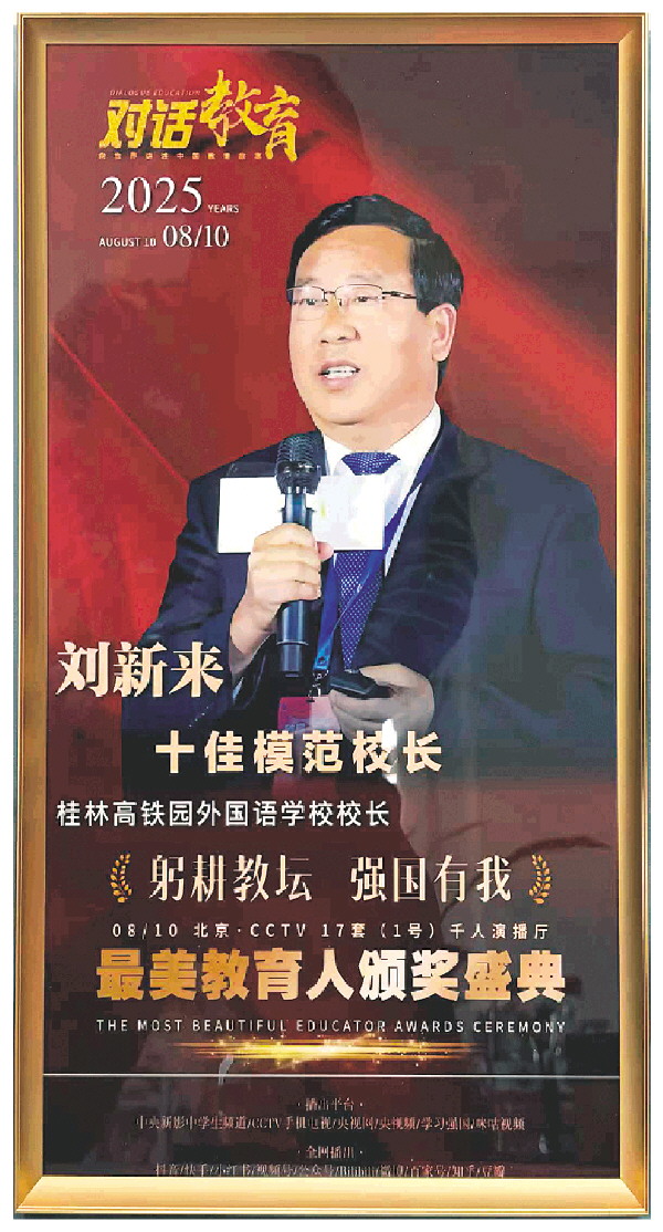 此次获奖,既是对刘新来校长教育情怀与办学智慧的嘉奖,也彰显了民办教育作为教育事业重要组成部分的独特价值。在建设教育强国的新征程上,刘新来校长将继续秉持教育家精神,带领桂林高铁园外国语学校书写更多“让每个生命都出彩”的教育篇章。(吴林峰 吕晗江)
