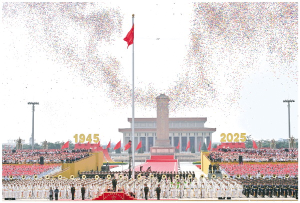 ▲2025年9月3日,纪念中国人民抗日战争暨世界反法西斯战争胜利80周年大会在北京隆重举行。这是纪念大会现场放飞气球。 新华社记者李贺 摄