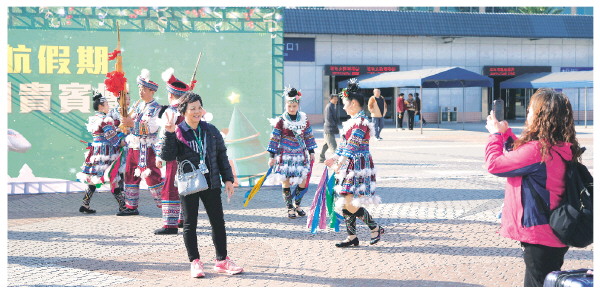 当天,为欢迎游客们的到来,桂林市文化广电和旅游局牵头组织旅游企业在桂林北站举办了欢迎仪式,芦笙声婉转回荡,舞龙表演精彩纷呈,让游客们纷纷驻足打卡。