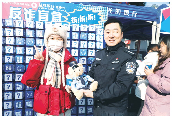 本报讯(记者陈静 文/摄)“关注领徽章”“反诈视力大挑战”“知识答题闯关”……12月26日上午,桂林市中心文化宫路段一片欢声笑语。新启用的文化宫街面警务室前排起了长队,各类趣味游戏让市民们乐在其中:民警手持案例展板,与市民“面对面”讲解最新诈骗手法;银行工作人员引导答题,为通关群众送上警察小熊玩偶、定制钥匙扣和暖心奶茶。“一边玩游戏一边学知识,还能领到这么可爱的小熊,今天这趟来得真值。”带着孩子前来的李女士笑道。许多市民表示,这种“接地气”的宣传方式让人印象深刻,在互动中轻松掌握了防骗知识。
