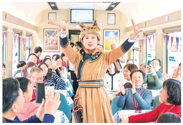 ◥12月28日,游客在旅游列车上观看鄂伦春族民俗表演。 12月28日,在哈尔滨开往亚布力的Y999/998次“悠享龙江·银旅号”旅游列车上,来自江浙等地的200多名游客开启跨年冰雪游之旅。这是黑龙江开行的首趟冰雪环线旅游列车,其行程为期6天,将经过哈尔滨、亚布力、阿里河、漠河等地。该趟旅游专列将持续开行至2026年2月。