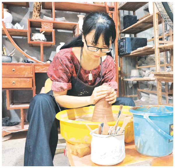唐晓娟在制作陶器。