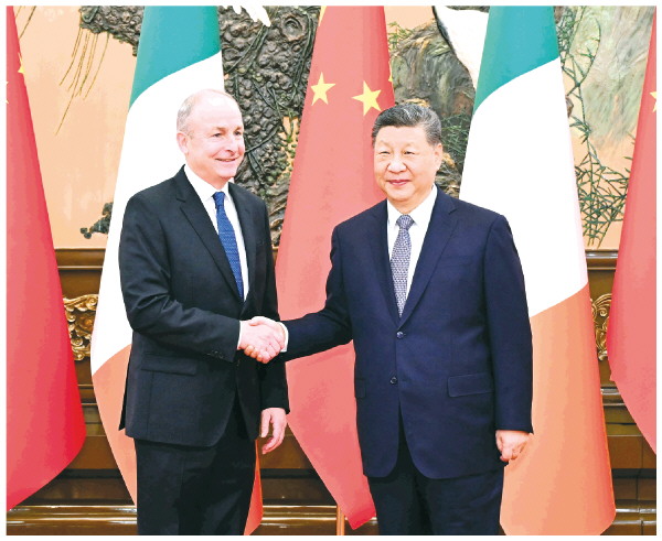 习近平指出,中国和爱尔兰都爱好和平、开放包容、自立进取,两国人民通过斗争赢得国家独立和民族解放,依靠几代人接续奋斗迈向现代化。2012年两国建立互惠战略伙伴关系以来,双边贸易额翻了两番,相互投资均衡发展,两国人民双向奔赴,助力各自国家发展。相互尊重、平等相待、互利共赢是中爱关系长期稳定发展的宝贵经验,双方要共同传承和弘扬。中方愿同爱尔兰加强战略沟通,深化政治互信,扩大务实合作,为两国人民谋福祉,为中欧关系添动力。