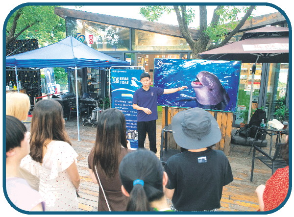 2023年6月28日,科普讲师何俊逸在武汉汉口江滩为市民做长江江豚保护科普。