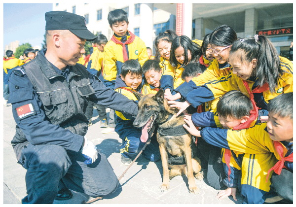 ▲1月8日,在湖南省永州市道县公安局警营开放日活动上,学生们近距离接触警犬。