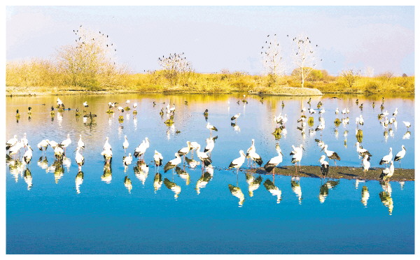 1月10日,鸟儿在江苏兴化里下河国家湿地公园内栖息、觅食(无人机照片)。 新华社发