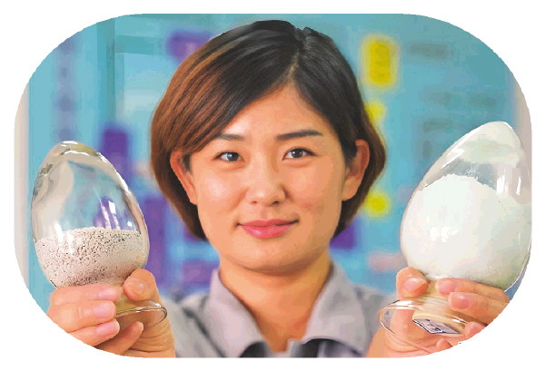 工作人员在展示从冶金固体废物中提取的银粉(左)和铟粉。 新华社记者杨世尧 摄