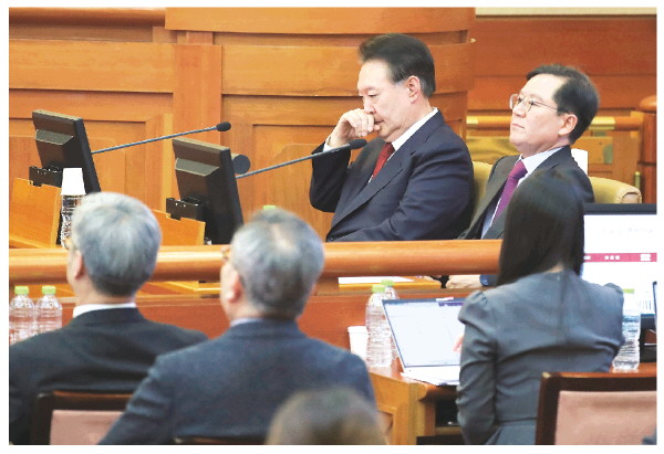 这是2025年2月20日尹锡悦(中)在韩国首尔宪法法院出席总统弹劾案庭审的资料照片。新华社记者姚琪琳 摄