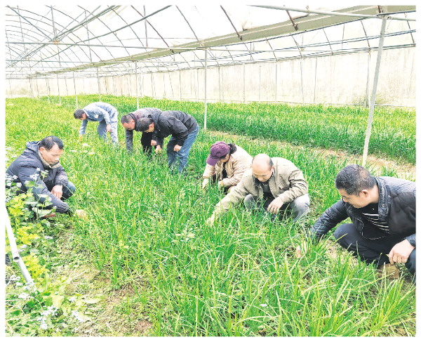 ▲阳学义在给工人们讲解除草要点。 记者刘菁 摄