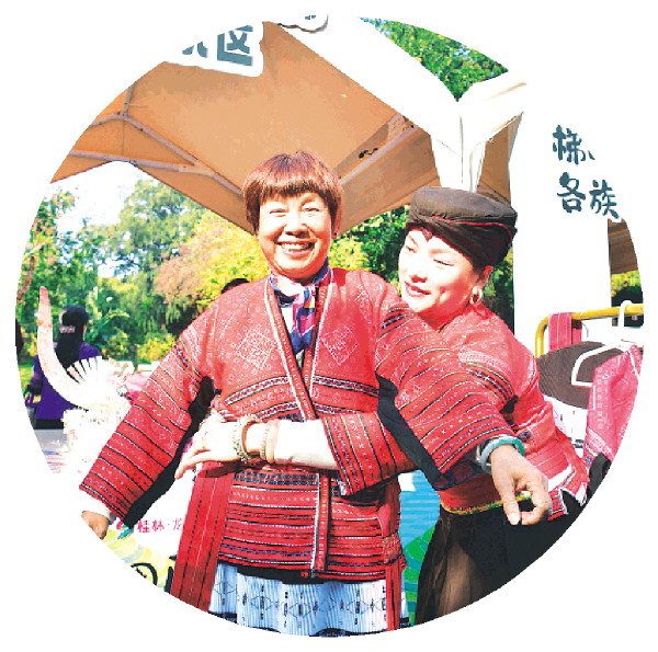 ▲在龙胜非遗市集上,深圳市民正在试穿民族服装。