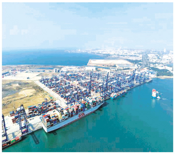 ▲1月14日,航拍海南洋浦区域国际集装箱枢纽港,巨轮靠泊进行装卸作业。