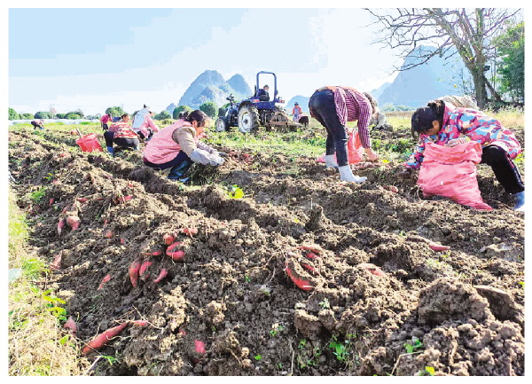冬日的临桂区茶洞镇,田间采收繁忙,车间机器轰鸣。一片片红薯地里,饱满的“西瓜红”红薯被翻出土;不远处,金黄透亮的红薯粉新鲜出炉。这里,科技赋能的现代种植与匠心传承的百年工艺,共同将小小红薯锻造成富民大产业,为乡村振兴注入蓬勃动力。