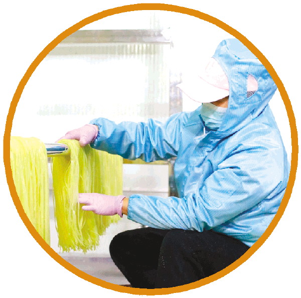 记者留意到,这里的红薯粉与普通红薯粉不同,呈现出独特的金黄色,且形状为扁形,与市面上呈灰褐色、圆形的红薯粉颇有不同。“为什么定安红薯粉会是金黄色的?那是因为在制作的时候加入了黄栀子。”总经理梁涛揭秘,“黄栀子是天然植物,具有清热、解毒、祛火功效,同时也含有天然黄色素。按照老一辈传下来的工艺,加入一些黄栀子,可以让红薯粉看起来色泽诱人,且绿色健康。”