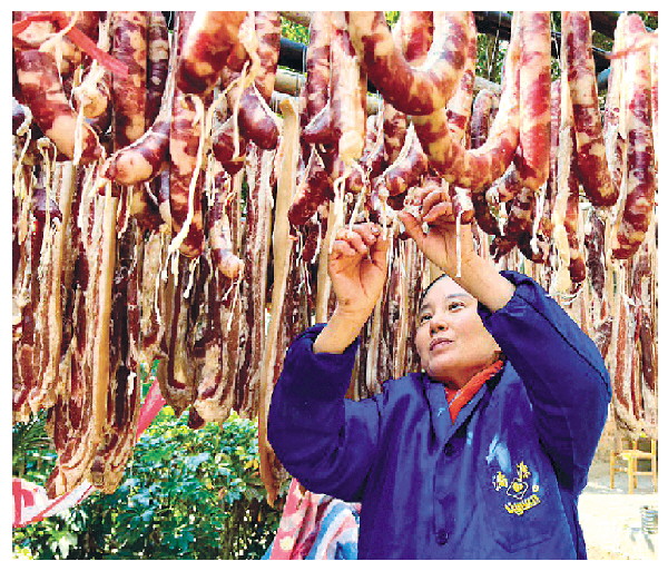 年节将至,腊味飘香。临桂区两江镇两江村委菜园村谢惠恩是腊味制作“大户”,她家里挂着一串串色泽红润的腊肠、一块块油光锃亮的腊肉,空气中弥漫着肉香与甘蔗清甜交织的独特气息。立冬至今,她已经制作了腊肠、腊肉、腊猪脚等多个品种。 记者周子琪 摄