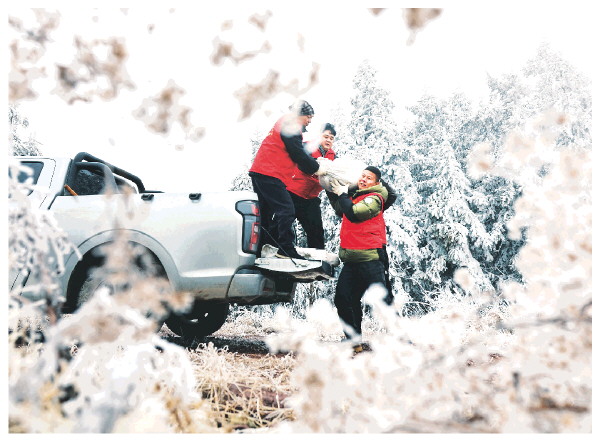 1月22日,在灵川县海洋乡小平村的山腰上,当地政府工作人员正在为群众运送物资。