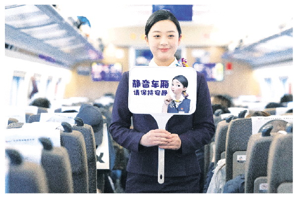 2月1日,铁路上海客运段乘务员在G12次列车车厢内手举静音车厢提示牌。
