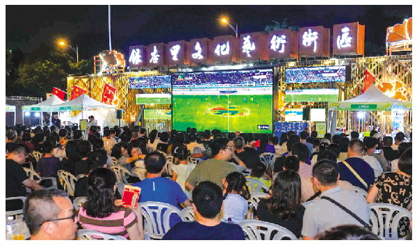 2025年10月4日,球迷在南京市建邺区银杏里文化艺术街区的“苏超”“第二现场”观赛。 新华社记者李博 摄