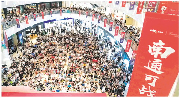 ◤2025年6月29日,市民、球迷在南通市内一处商场观看“苏超”第五轮南通队坐镇主场对阵宿迁队的比赛直播。 新华社记者李博 摄