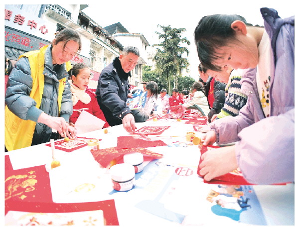 ▲2月3日,秀峰区丽君街道九岗岭社区联合桂林市第三人民医院、秀峰区委组织部及桂林榕湖酒店管理集团有限公司在社区文化广场举办“党群连心启新程 健康科普迎新春”主题活动。活动集文艺展演、健康科普、便民服务与传统文化体验于一体,吸引了数百名居民积极参与,现场气氛热烈、温情洋溢。图为社区居民体验剪窗花和拓印。