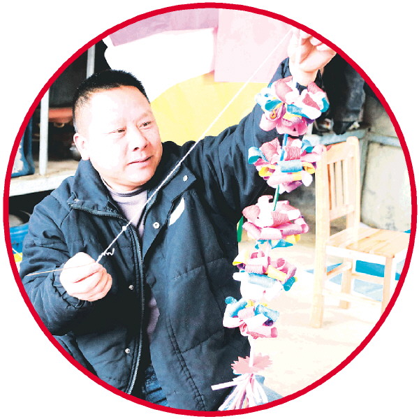 ▲村民将一朵朵纸花扎成一串。