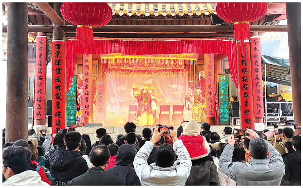 ▲2月17日,农历正月初一,恭城瑶族自治县武庙戏台上演传统桂剧《天官赐福》,吸引不少市民游客驻足观看。 记者黄敏 摄