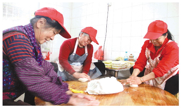 ▲恭城瑶族自治县恭城镇高浪村几位瑶家妇女围坐一起制作水浸粑。