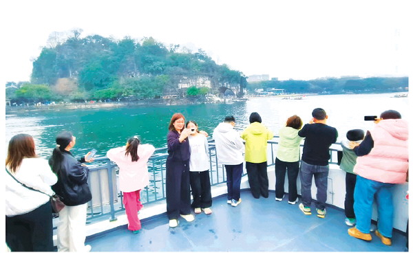 春节假期,来自五湖四海的游客乘船观赏春日漓江。图为游船经过象鼻山时,人们与象鼻山合影留念、拍照打卡。 记者苏展 摄