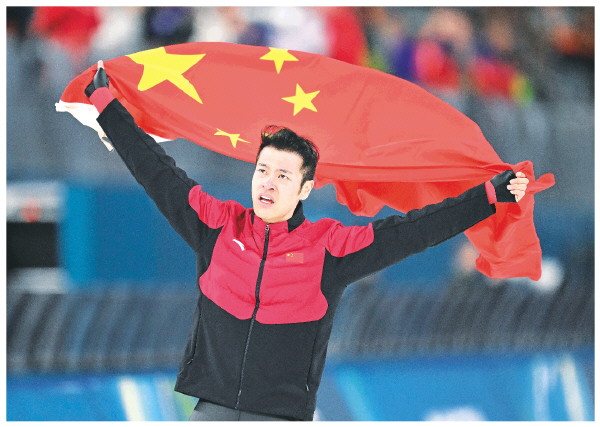 ▲2月19日,宁忠岩在赛后身披国旗庆祝。 新华社记者武巍 摄