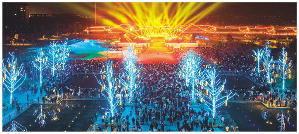 2月21日,游客在荆州楚文化数字产业园观看“荆州十二时辰·楚乐八百年”演出(无人机照片)。新华社发