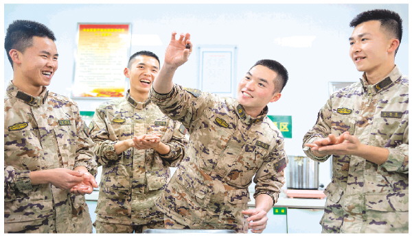 武警官兵们在食堂里揉搓汤圆馅料,现场欢声笑语不断。