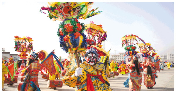 3月3日,社火队员在甘肃省临夏回族自治州永靖县太极镇大川村表演。