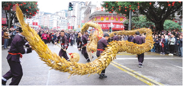 草龙展演吸引群众驻足观看。 韦吉阳 摄