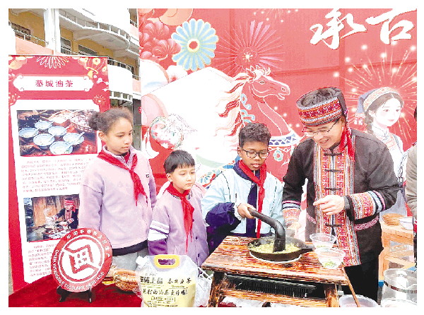 桂林市樟木小学春季开学仪式精彩纷呈。孩子们亲手捶打恭城油茶,品味“中国咖啡”的独特醇香;糖画艺人以勺为笔、以糖为墨,勾勒出栩栩如生的吉祥纹样;非遗团扇绘制让同学们在笔墨间邂逅东方美学;婉转悠扬的彩调唱腔,让传统戏曲魅力在校园回荡。