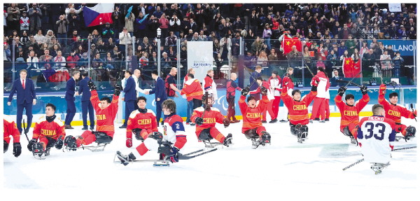 ▲当地时间3月15日,在意大利米兰举行的米兰-科尔蒂纳冬残奥会残奥冰球铜牌赛中,中国队夺得季军。 新华社记者李京 摄