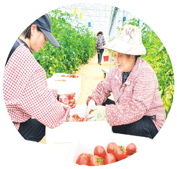 ▲雁山区万亩设施农业基地核心示范区内,工人正在打包采摘好的西红柿准备外运。