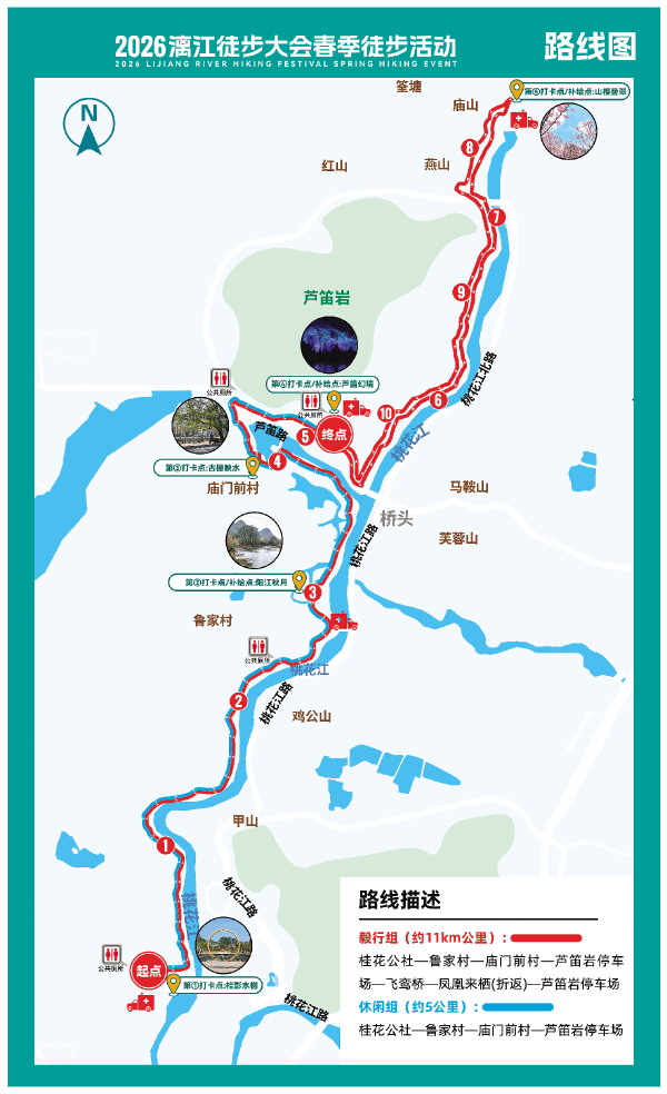 2026漓江徒步大会春季徒步活动将于明日举行,近2万名徒步爱好者期待着用脚步丈量这条桂林经典的山水走廊——从桂花公社出发,途经鲁家村、庙门前村,打卡“桂影水榭”“阳江秋月”“古樟映水”“芦笛幻境”,部分参与者还将经过飞鸾桥、凤凰来栖,感受“山樱叠翠”,并在位于芦笛岩的终点收获纪念奖牌。