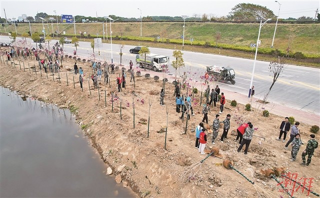 潮安区东凤镇党员和群众代表在护堤公路共同植下紫花风铃木、柳树、黄槐。