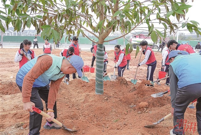 潮州市绵德小学的同学们齐心种树,共同为建造绿色家园出力。