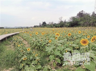 走进这片金色花海,朵朵葵花灿烂盛开,金黄的花瓣、橙黄的花蕊,在翠绿枝叶的映衬下美不胜收,宛如一幅治愈人心的美景油画,时有蜜蜂穿梭其中,更增添了几分生趣和情致。不少游客举起手机,记录美好时光。“这里的花开得很美很漂亮,随手一拍都是好看的照片,很喜欢这个地方。”游客罗晓兰一家三口以花海为背景,在这里拍照“打卡”。