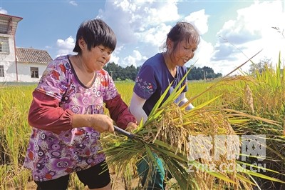 适逢秋季,稻米飘香,又到了水稻收割的季节。近期,乐至县21万亩水稻陆续成熟,成片的稻田里,稻穗低垂、谷粒饱满。清风拂过,伴随着收割机马力全开的嗡鸣声,阵阵稻香卷起,好一幅秋收“丰”景。图为村民在收割稻谷。