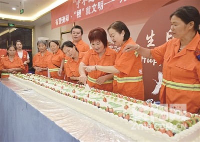 环卫工人代表切蛋糕。