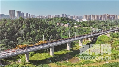 9月6日,在四川省泸州市冯湾特大桥施工现场,随着第一组500米长的钢轨稳稳落下,渝昆高铁川渝段全面进入铺轨阶段。渝昆高铁是全国铁路网“八纵八横”主通道之一的京昆通道的重要组成部分,设计时速350公里。图为渝昆高铁川渝段铺轨施工现场(无人机照片)。