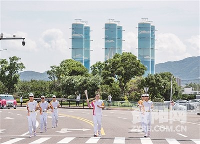9月13日,杭州亚运会火炬在浙江省舟山传递。图为火炬手谢波在火炬传递中。
