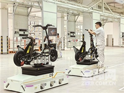 落户资阳临空经济区的欧洲油摩生产制造企业Keeway公司,拟投资7.5亿元,建设国内高技术水平和高自动化水平的电动交通工具西南生产基地。图为工人正加紧调试生产线。