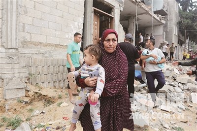 巴勒斯坦加沙地带卫生部门10月28日发布的数据显示,以军袭击加沙地带已造成7703人死亡、19743人受伤。加沙地带民防部门当天在声明中说,以军27日夜开始加大对加沙地带的空袭,导致当地数百栋建筑“完全被毁”。 图为10月29日,在加沙地带南部城市拉法,人们经过被以军空袭损毁的建筑。